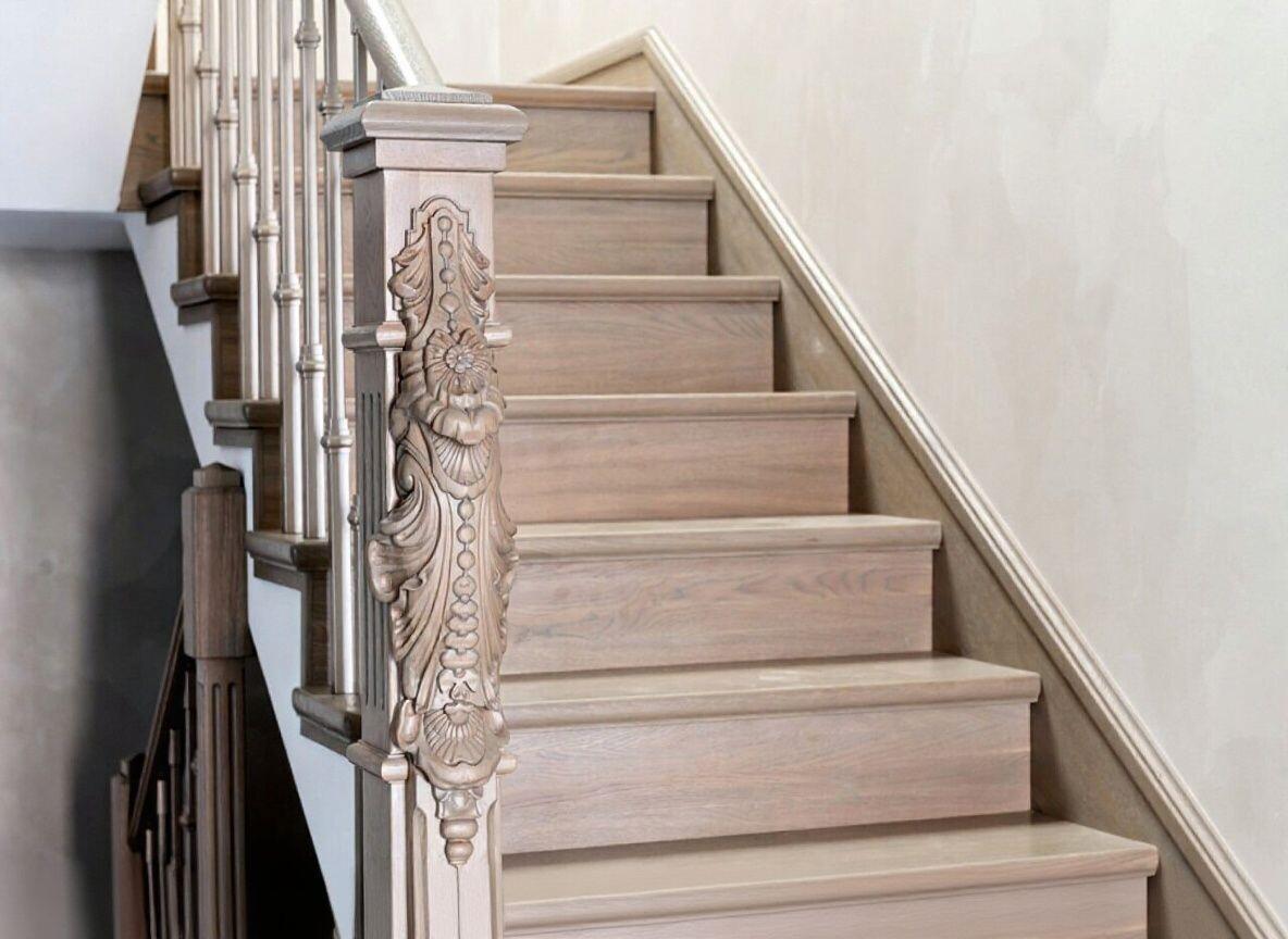 Основой дизайна стал благородный ясень. Из него выполнены все элементы: от широких ступеней и подступенков до изящных балясин. Светлый оттенок дерева делает лестницу визуально легче, а единство материала создает целостный, гармоничный образ. Массивные резные столбы служат надежной опорой и акцентом, контрастируя с тонкими вертикальными балясинами с аккуратной резьбой.