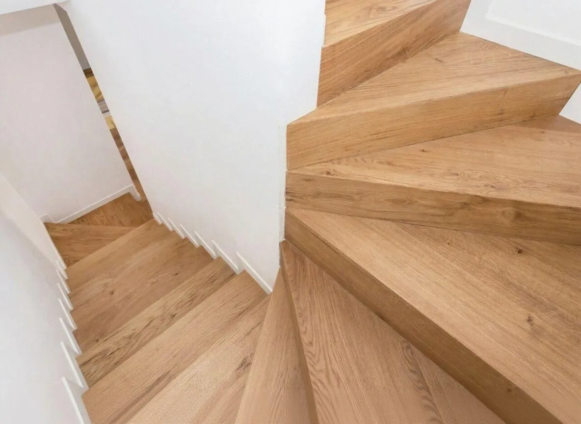 1. Профессионально выполним облицовку вашей лестницы с забежными ступенями массивом дуба, ясеня или бука. Превратим сложную геометрию лестницы в главное украшение вашего дома.